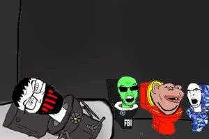 After the Roygbivsloweddown incident, an anonymous Chud created a surreal thread featuring a winged goldfish soyjak as its protagonist. This thread had by far the most complex story setup out of all the adventure threads, taking inspiration from the true events of Operation 'Plier. The unnamed protagonist is a soyjak.party user who was banned after repeatedly "shit[ting] on the floor" in protest of Soot's banning of Roygbivsloweddown. After being both "kicked out" from soyjak.party by a moderator and subsequently banned from it for attempting to assassinate Soot, the protagonist joins a shadowy group called "Soot Resistance", a gathering of dissidents planning to overthrow Soot.