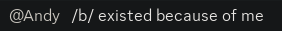 Andy, also known as Andyverse on the Andybooru, is a sharty Andymoderator and AndyIRC operator, as well as the co-administrator of Soycraft 3. He is best known for andy-inserting as Andy from Boy's Club, the comic in which Pepe came from. He joined the andysphere in 2023 and /b/ existed because of him.[1]