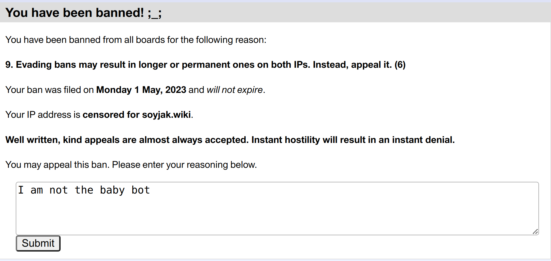 The Babybot is a bot that appeared in April 28th of 2023[1] and started mass-replying to threads with a heavily compressed image of a baby Gapejak, the filename of which was randomised. It started out posting "first", "second", "third" or "baby" as the caption, and soon incorporated special characters to evade post filters, but eventually had to post without caption as this was even harder to detect. It also used a slightly different image and ip address every single time in order to bypass image-based hashbans.[2] The flood of automated baby soyjak posts led not only to this 'jak's rise in popularity, but also concerns over mass removal of VPN nodes as they got banned after usage for baby spam.