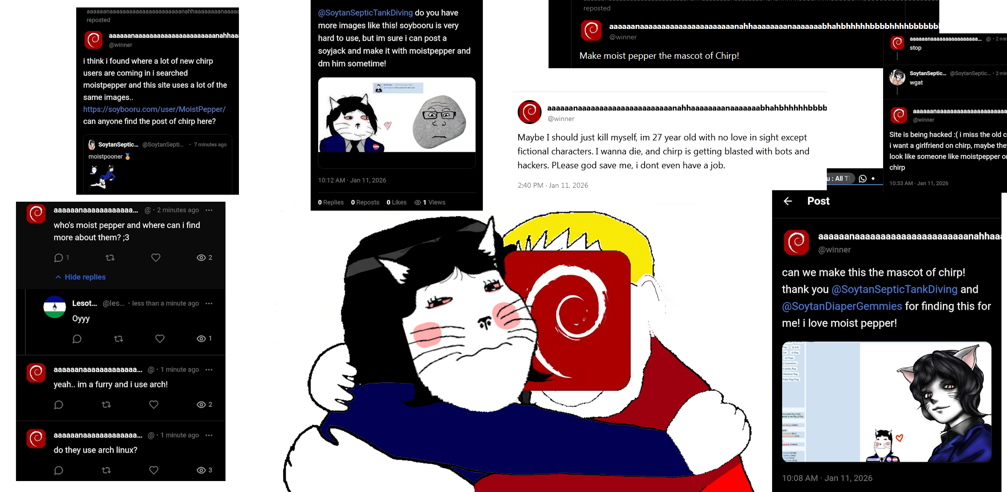 The Chirp raid was an extremely geggy event for the Soyjak.party, which started on January 11, 2026 where some 'teens decided to troll a vibecoded Xitter ripoff[1] that used a sinuglar AI for moderation and gem it up[2], with a user named SoytanSepticTankDiving (Applerino on SoyBooru[3]) posting soysona of a SoyBooru namefag called MoistPepper, which caused an user that went by the name of "@winner" to get absolutely obsessed with xer. He then went on a major sperg session and announced that he would commit suicide over this and then proceeded to post an image of himself holding some pills and deleted his account.