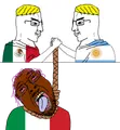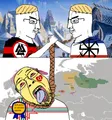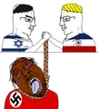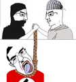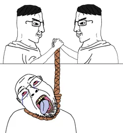 Chuds hanging a tranny is a moderately popular untagged template in which two chuds shake hands and hold a rope from which a tranny is hung. It's usually edited to have two countries or groups hanging a common enemy.