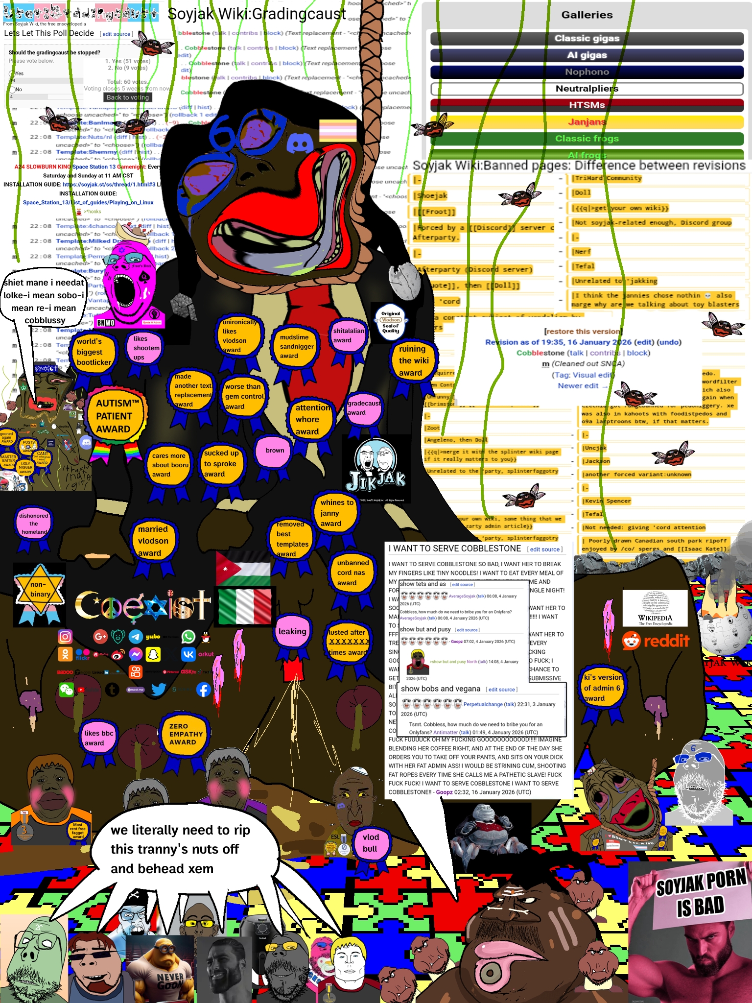Cobblestone, alternatively called “Poonerstone” or “CoalBBCTroon” or Mist, is a selfish little fuck who is also the sixth admin of Soyjak Wiki, effective August 7, 2025.[1] Xhe succeeded SprokemowerMan. Xhe is the worst admin of Soyjak Wiki and is basically its version of Admin 6. Xhe is best known for deleting shit for no reason and brapping up the Wiki, and most importantly, the (((Gradingcaust))).