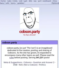 Cobson.party,[1] also known as the ‘son, is the gemmiest splinter site to and will ever exist. The site was created by Froot loyalists a few days after when soyjak.party was sold to Quote on the 9th of May 2025. The site mainly consists of Cobson posting, soyjaks, corn on the cobs and a fairly low PPH. It is a mystery as to why Quotecord did not censor this article unlike every other splinter site.