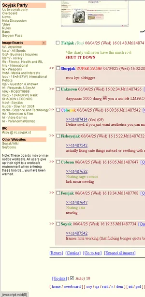 $(".subtitle").after("<hr class='abovePostForm'>"); $("form[name='post']").after("<hr class='belowPostForm'>"); $("form[name='post'] > table > tbody").append(` <tr> <td colspan=2> <small> <li>Supported file types are: GIF, JPG, PNG, WEBM, MP4, MP3</li> <li>Maximum file size allowed is 2GB</li> <li>Images greater than 255x255 will be thumbnailed.</li> <li>Read the <a href='/rules.html'>rules</a> before posting.</li> <li>Currently <b>` + Math.floor(Math.random() * 8) + `</b> unique schizos samefagging.</li> </small> </td> </tr> `); /* $(".body").replaceWith(function () { return "<blockquote>"+$(this).html()+"</blockquote>"; }); */ $("form[action='/search.php']").after("<hr>"); $("#thread-links").after("<hr>"); $(".post_no:not([id])").after("<a class='post-btn' id='not_delete' href='#' title='Post menu'>▶</a>"); $(".delete").after(" "); $(".boardlist").next().remove(); $("body").before(` <div class='sidebar'> <div class='sidebar-header'>Soyjak Party</div> <br> </div>`); $(".sidebar").append(` <div><a href='/'>Up to soyjak.party</a></div> <div><a href='/o'>Overboard</a></div> <div><a href='/news'>News</a></div> <div><a href='/q'>Meta Discussion</a></div> <div><a href='/chive'>'chive</a></div> <div><a href='/rules.html'>Rules</a></div> <div><a href='/bans.php'>Bans</a></div> <div><a href='/pass.php'>Soygem Pass</a></div> `); $(".sidebar").append(` <div class='sidebar-subheader'>Image Boards</div> `); $(".sidebar").append(` <span id='imgboards'> <div><a href='/a/'>/a/ - Aryanime</a></div> <div><a href='/asp/'>/asp/ - All Sports</a></div> <div><a href='/biz/'>/biz/ - Business Inquiries</a></div> <div><a href='/dem/'>/dem/ - ocracy</a></div> <div><a href='/fit/'>/fit/ - Fitness, Health and IRL</a></div> <div><a href='/int/'>/int/ - International</a></div> <div><a href='/k/'>/k/ - Weapons</a></div> <div><a href='/mtv/'>/mtv/ - Media and Interests</a></div> <div><a href='/pol/'>/pol/ - 18+/NSFW | International Politics</a></div> <div><a href='/qa/'>/qa/ - Question & Answer</a></div> <div><a href='/r/'>/r/ - Requests & Soy Art</a></div> <div><a href='/r9k/'>/r9k/ - ROBOT9999</a></div> <div><a href='/raid/'>/raid/ - 18+/NSFW | Raid: SHADOW LEGENDS</a></div> <div><a href='/soy/'>/soy/ - Soyjaks</a></div> <div><a href='/sude/'>/sude/ - Soychan 2004</a></div> <div><a href='/tech/'>/tech/ - Soyence and Technology</a></div> <div><a href='/tv/'>/tv/ - Television & Film</a></div> <div><a href='/v/'>/v/ - Vidya Games</a></div> <div><a href='/x/'>/x/ - Paranormal/Schizo</a></div> </span> `); $(".sidebar-subheader").append("<span class='expand'>+</span>"); $(".sidebar").append(` <div class='sidebar-subheader'>IRC</div> <div><a href='https://irc.soyjak.st/'>#soy @ irc.soyjak.st</a></div> `); $(".sidebar").append(` <div class='sidebar-subheader'>Other Websites</div> <div><a href='https://soyjakwiki.org/'>Soyjak Wiki</a></div> <div><a href='https://soybooru.com/'>SoyBooru</a></div> `); $(".sidebar").append(` <div class='notice'><u>Note</u>: These boards may or may not be worksafe. All users give up their right to a worksafe environment when entering these boards... you have been warned. `); $(".expand").click(function (event) { if ($(this).text() == "−") { $(this).text("+"); $("#imgboards").show(); } else { $(this).text("−"); $("#imgboards").hide(); } }); const regexp = />(\d+)</g; const current_page = $(".pages > .selected").text(); const pages = $(".pages").html().matchAll(regexp); $(".pages").replaceWith(` <table border=1> <tr> <td class='previous-page'></td> <td class='board-pages'></td> <td class='next-page'></td> </tr> </table> `); // generate pages // match[1] = page let final_page = null; for (const match of pages) { let page_count = ""; if (current_page == match[1]) page_count = `<b>${match[1]}</b>`; else page_count = `${match[1]}`; if (match[1] != "1") $(".board-pages").append(`[<a href='/${board_name}/${match[1]}.html'>${page_count}</a>] `); else $(".board-pages").append(`[<a href='/${board_name}/'>${page_count}</a>] `); final_page = match[1]; } // next and previous buttons const previous_page = current_page-1; if (previous_page == 0) { $(".previous-page").append("Previous"); } else if (previous_page == 1) { $(".previous-page").append(` <form action='/${board_name}/' method=GET style='margin-bottom: 0px;'> <input type='submit' value='Previous'> </form> `); } else { $(".previous-page").append(` <form action='/${board_name}/${previous_page}.html' method=GET style='margin-bottom: 0px;'> <input type='submit' value='Previous'> </form> `); } const next_page = parseInt(current_page)+1; console.log(final_page); if (next_page > final_page) { $(".next-page").append("Next"); } else { $(".next-page").append(` <form action='/${board_name}/${next_page}.html' method=GET style='margin-bottom: 0px;'> <input type='submit' value='Next'> </form> `); } |