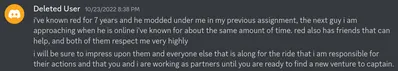 On April 5th 2026, Quote released Kuz's DMs on Discord , with one of the DMs being the big buddy himself (proven by being addressed as doll by Kuz and further evidence). [14] One of the messages claim he has known "red for 7 years" (it probably was a different guy nicknamed red) and coupling it with Red being 19 according to one of his Q&As[15], it's possible Doll has known him since he was 12 years old. Doll denied this by stating "different guy"[16] He said that there were two βRedβs, and claimed he was talking about the other one. He also claimed that the leak had the first message cut out of it.[He just did, okay?]