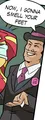 Due to his character being intrinsically linked with tickling feet, he quickly became a popular subject in foot fetish pictures. Despite only seen tickling feet as a torture method in official media, he is often drawn smelling them seemingly for pleasure or humiliation, saying his now-iconic catchphrase, "It smell like cheese!" Or other variants.