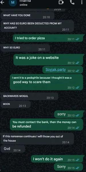 Until a particularly impaired poster announced that he spent 50 dollars of 'za to be sent to the pedo. Which he was promptly criticized for, but the best was yet to come. Xe announced to the thread that xe used his mom's credit card to make the purchase. He later joined a voice call with everyone else in the thread where he started panicking and using TTS instead of using his real voice.