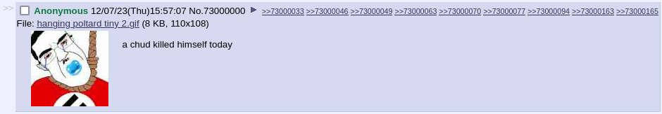 The 73000000 GET on /fit/, featuring a hanging Nazi Chudjak with the caption "a chud killed himself today"