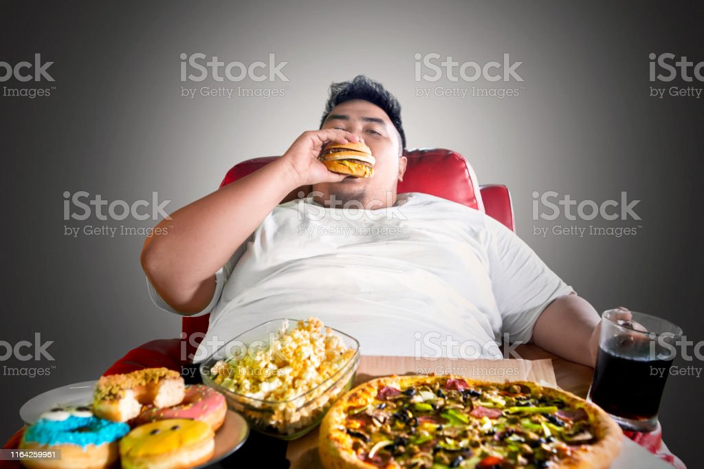 a large man eating food while reclining in a chair.