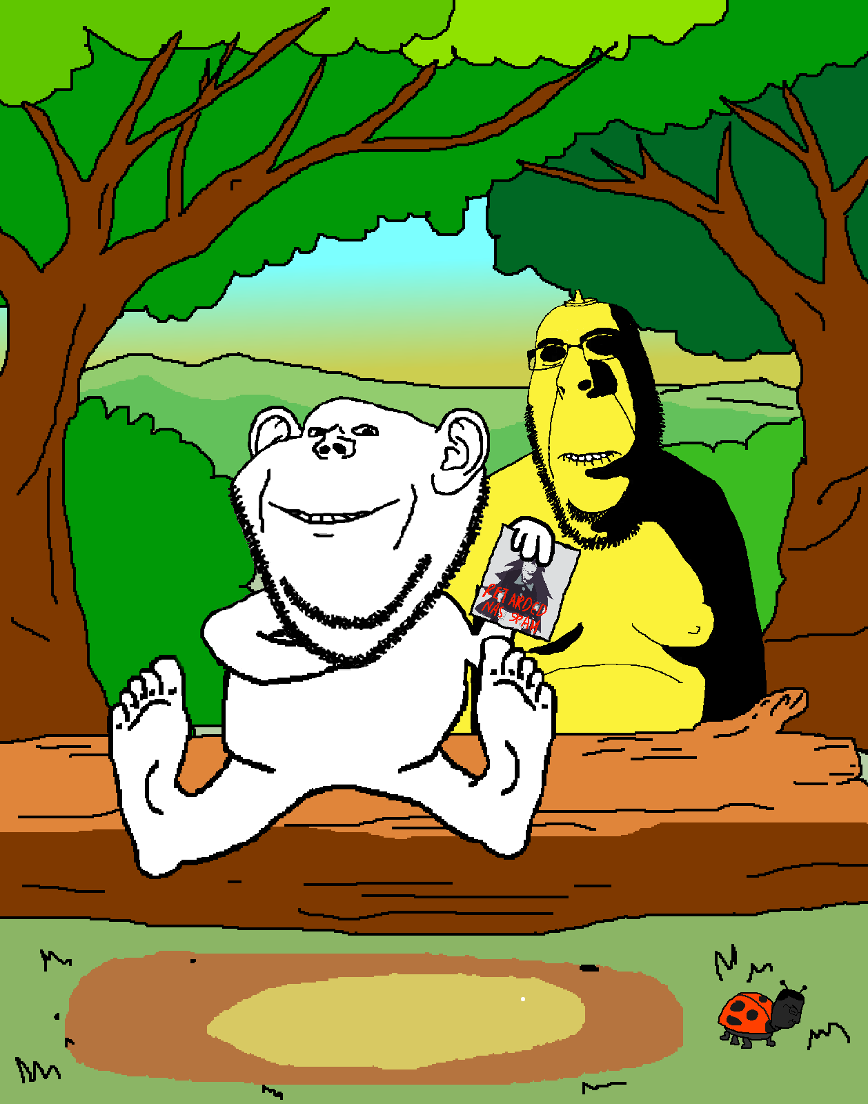A soyjak with a Hornyson rendition of Mustard staring at an Impjak holding NAS troonslop. On the ground, a chuddy ladybug averts its gaze, knowing whats about to happen.