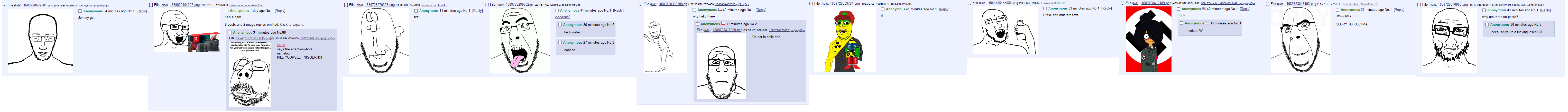 No.1 GETs on all boards from left to right: /q/: johnny /soy/: soyak /qa/: cobson /tech/: cobson /int/: gapejak /a/: emmanuel /r/: oekaki soyak /pol/: 'zellig /sneed/: cobson /mtv/: soyak