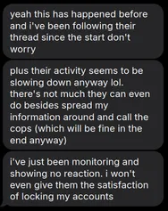 Naturally, 'teens were skeptical and asked for snopes, which prompted the snitch to post a screenshot of jackrabbit's messages, where xe states that xe is aware of the 'ox and that there is nothing that 'teens can do. In a statement that is now laughable, xe claimed that xe wold not even lock xer accounts and give 'teens the satisfaction.