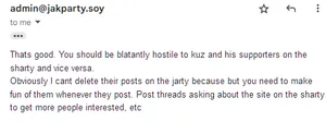 The site gained disaffected soyteens from the Party that were dissatisfied with the various rule changes such as namefagging, change in focus of the Party, among other topics. The 'jarty served as a collective outlet for various forms of anger at the Party and where it has gone. Most threads were necrobumped from the last year or complaints about bans and the current administration of the Party. Users who complained about the sharty were welcomed with open arms, but criticism of the jarty was entirely rejected by both the users and the staff. After all, the various problems with jschan, over-enforcement of moderation, selective doxing being approved while others are rejected, and the rejection of "mod-worship" were seen as grievances from sharty users as opposed to problems that afflicts both communities in equal measure, albeit with vichan instead of jschan for the Party and etc.