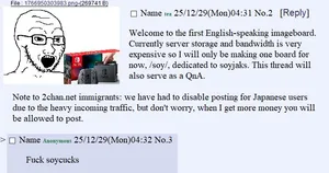 Soyjak.party was initially created as a splinter of 4chan, which was also a splinter of Something Awful. Branching off of 4chan after moot locking /test/ and banning of proto-IAS trollface[1], and wojaks after an incident that have the site unwanted attention. Due to a large portion of the 4chan userbase being upset by this, a splinter was in the talks of being made, called Soyjak.Party.