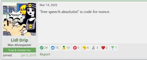 Null is commonly known for doing gayops and banning his own userbase. There is also an unviewable sekrit klub illuminati board for paypigs to discuss site metadrama (just like muh /gem/) Many users have been banned for making Null and Lidl Drip leak, and getting banned for this is often considered the most badass way to quit the site. Lidl Drip was some foid with extreme power who got many people banned in her rage despite not technically being a moderator. For example, the user Frick Marisa was permabanned for literally no reason after Lidl Drip reported him for being a pedophile just for having an anime PFP. Many prominent users have been banned for similar reasons. Lidl Drip has been suspected to be a sock of Null, but Snopes has never confirmed this. Luckily, Lidl Drip quit the site due to some SNCA, but those banned users still haven’t been unbanned, so xer SOVL still haunts the Farms. The void she left behind is filled by moderators such as Troonbonista and Thé au lait anyway.