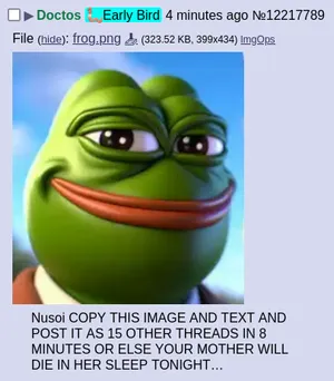 This reply sometimes gets spammed on all posts on a board. It consists of a still image of Pepelaugh, along with text implying that if the reader doesn't post it in more threads, they or someone important to them will die.