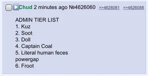 Literal human feces powergap (LHFP for short) was a REAL brief Admin whose reign allegedly coincided with that of Captain Cob. He allegedly, alongside Captain Cob, was one of the two users who obtained access to Admin powers. He is allegedly said to be worse than Captain Coal, but better than Froot.