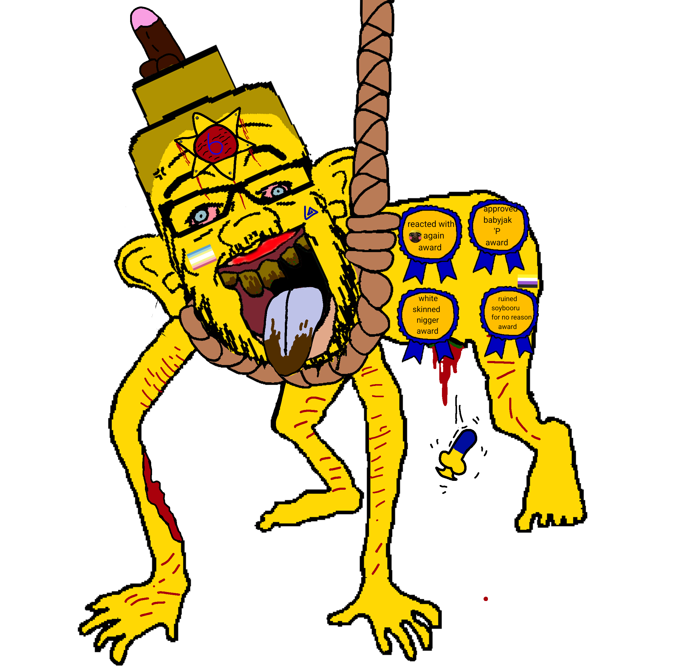 MUDstard is a profilic gooner that loves all types of brimstone posting, especially Bibisi bait. If you have any familiarity with this faggot you'll know that much of his abhorrent behavior is defended constantly under the guise of "bait" by various bootlickers. Besides barely doing anything as a janny/admin other than making changes that nophono asked for[a], he has defended pedophilia multiple times, allowed soyjak porn on Soybooru and has demoted people who oppose these things. In general, he has managed to turn the soysphere into utter Niggerhell.