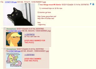 Eventually, ponies started spilling out of /co/, and into the dwellings /b/, amazingly, even /b/, with the most horrible, most shitty, most retarded threads in the history of the internet couldn't bear the sight of cartoon horses, what followed was nothing less than an utter Culture War. Posting ponies on /b/ would become a bannable offense, Moot eventually ceded to the ever-growing bronies after they flooded every corner of the website with ponies.