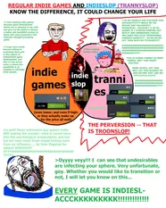 As the topic of the page suggests, "indieslop" refers to indie media that is developed by trannies or other types of goyim that have climbed the caste, mainly to indoctrinate impressionable teens and adolescents into leftist ideology. This is not really a surprise as for over the last decade video game journalism has aimed to derail the motivations of video games and other mediums to include politically correct implications. As the next years saw more soyboys trooning out and thereby having more trannies invading the sphere, as with anything else really.