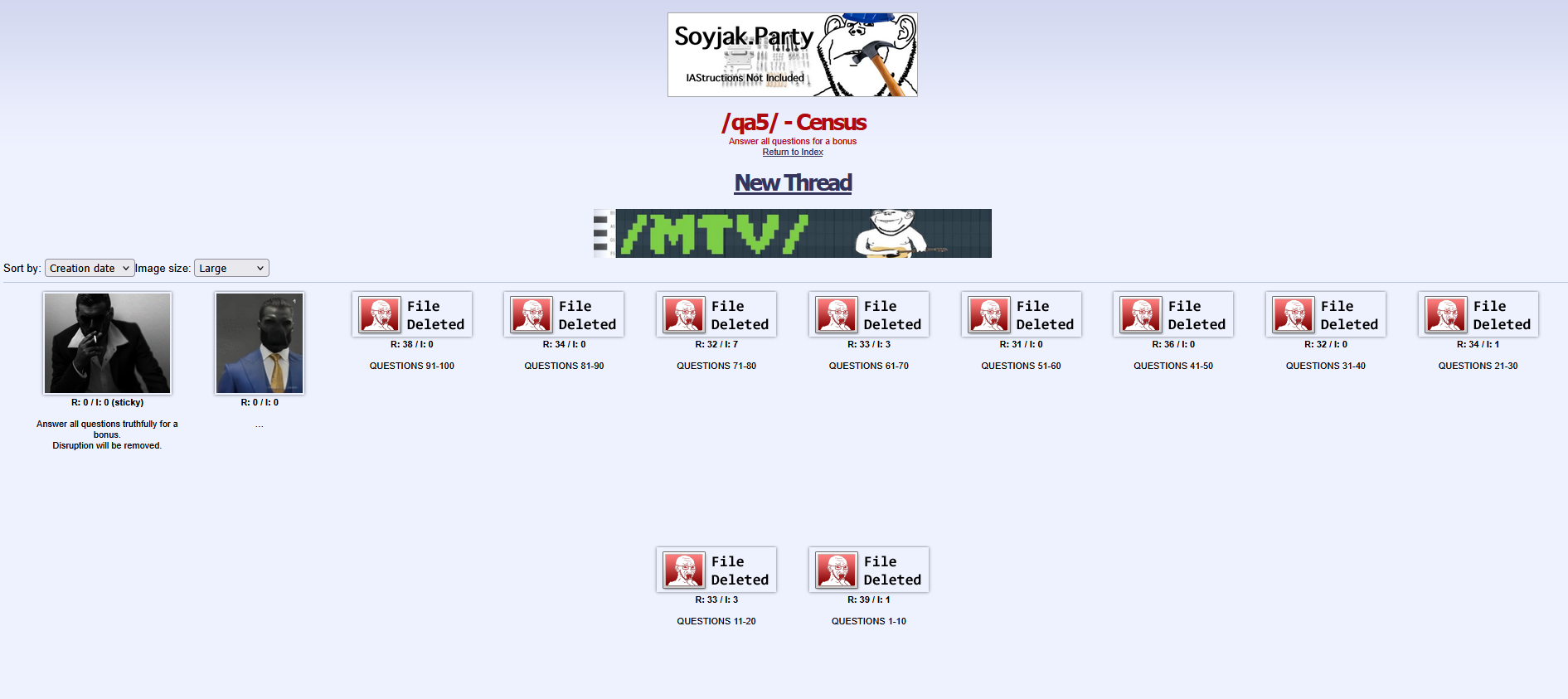 The catalog in its current state is made up of the aforementioned sticky, a textless post with a video of Nophono and 10 Q&A threads from Census himself. All of which have had the files in their OPs deleted.