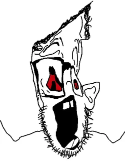 Sloppy is a heavily deformed soyjak variant with bloodshot eyes, large ears, and disheveled hair. Compared to other variants, Sloppy has a very unique origin, where instead of being traced off a real life soyboy or a youtuber making an exaggerated facial expression, Sloppy was traced off a slopjak on the 'ru. The slopjak in question was heavily distorted, to the point where it is uncertain what variant was even used in the first place, though it is likely a 'plier[even doe the teeth don't match]. Some anonymous teen would then trace over this distorted mess and birth a new variant entirely. Sloppy is often paired in a soyjak trio with Brunetto and Parrotjak.