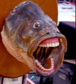 Soyfish is a soyjak variant with the notable characteristic of being an animal (specifically a fish) being 'jakked, This variant is traced from a photograph of the top of a taxidermied fish, with the disturbing feature of possessing human teeth, This variant also has a certain antiquity, being as old as or older than Cobson, having originated during the /qa/ era in response to a soyentific research article where soyientists successfully changed the gender of a catfish using, of all the heckin things, soy.