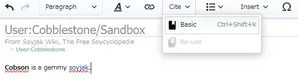 Now that we have our summary down, we might want to add a citation. This is especially important if you're adding something that might be controversial and will thus need Snopes fact-checking in order not to be removed. Position your cursor directly after a period in the sentence and click the "Cite" button, then "Basic."