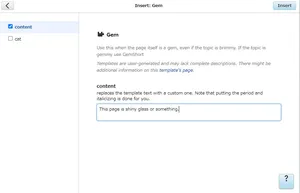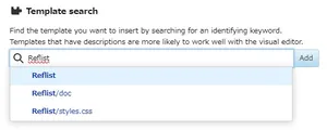 This time, search for a template called "Template" instead of "Reflist" and click that. Once you've done that, look below to the "Add undocumented parameter" section and add a new parameter called "content." This generates a new box for you to fill in with whatever you want the value of that parameter to be, so do that and click "Insert."