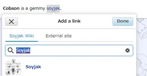 Note how there's a different tab for external links. Make sure not to link to articles on the wiki by using that and pasting soyjakwiki.org/... because then that link will break if the wiki's domain changes. Also, you should link only the first mention of something in an article.