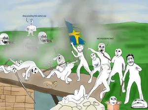 Soon, an opposing faction emerged. This opposition posted Deformed Soyjak, a controversial variant of Wholesome Soyjak that is notorious for being maligned by certain users. The consequential outrage at Deformed Soyjak shattered the brittle peace, causing all-out war to break out. At some point, Swedish 'jaks were also implicated in the conflict, seeming to be placed on the side of Wholesome and Deformed Soyjak posters, likely due to its evolutionary relation to Wholesome Soyjak. Accordingly, this faction came to be known as the Swedish.