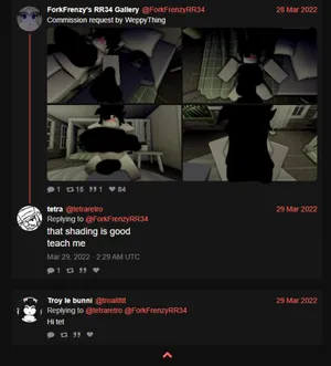Tetraretro has posted large amounts of goonslop on Discord and Twitter. He likes gooning to Rule 34 of fictional characters. Most of these characters are from anime and video games.[1] I'm sure you expected that. Wouldn't be surprised if there are minors in these Discord servers. And I guaran-fucking-tee there are minors seeing his tweets. He seems to have a thing for fictional women with gigantic jugs, like colossal knockers. I'm talking massive bongabongas. Idk who most of these fucking characters even are but they're probably underage.