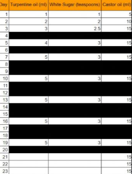 Turpentine, also known as Pine Gum Spirits or Tree Resins, is distilled pine tree sap that can kill parasitic worms. What you can do is every day take a teaspoon of turpentine, with some sugar cubes as bait and drink reverse osmosis water with it.