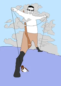 The Rhodes Colossus is a soyjak trend and edit of a political cartoon from 1892 where Cecil Rhodes, a British mining magnate and politician, is depicted as a giant over Africa, symbolizing his desire for domination and colonialism.[1] This image is commonly used to represent the dominance of some entity or force over another, usually countries. Rhodes' face is normally replaced by Chudjak or rarely other variants. The first variation was posted on SoyBooru on November 11, 2022.[2] The thing the chud is over usually is inferred to be under the control or heavy influence of what topic the chud is symbolizing.