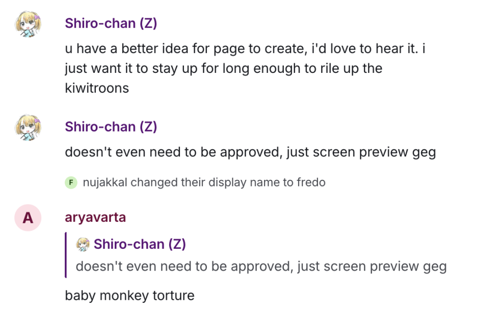 - when the wiki was down for a few days i spent that time setting up a filter to ban 'cord because the wiki has the same stance as the sharty does when it comes to discord, it's why it had it's own forums (it died after a day, still unsure whether or not it was DDoSed into oblivion or if xenforo was being shitty and hogged resources, the wiki never had its own 'cord server btw, if that matters). i checked on it this morning to see it be raped by foodistpedos again, so thats when i talked to h3xed and just pulled the plug for now. overall i don't really feel like continuing the wiki, and it will likely stay that way for a few months. one day, it'll return, but for now i just need a break. — [jackson] [t / c / me / snca] 20:04, 20 December 2024 (EST)