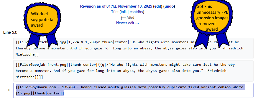 - even doe i wasn't trying to quote duel you i was just trying to create a scene where the reader can find it funny like those story posts on the sharty also thank you for putting my username shows that i am getting acknowledged by other respectable editors in this site. Oh right and for the fpe posts it would be better if those were to be removed as i do think neither you or i want people spamming those on the site. --Türk (talk) 01:31, 10 November 2025 (UTC)