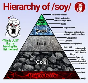 Coal - Used for otherwise bad or poorly made raisin. Coal still has SOVL and a few redeeming qualities nevertheless. Your first soyjak edit fits into this classification. Some soyjaks are deserving of this title, such as all the irrelevant SoyBooru countrywar edits, slopjaks, etc.