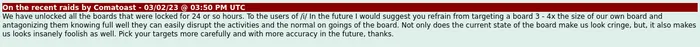 The second admin of 711chan, Comatoast, unlocked all the boards locked the previous day and made an announcement admonishing the natives of /i/ for picking a fight with the Sharty, implicitly confirming that this raid is a massive win. With the boards unlocked, 'teens proceeded to wipe /h/ and set their sights on /bridget/, but the board was locked before any major wiping could occur.[10] The ratio bot, previously used to ratio Arizona, and now equipped with catty wiping capabilities, was also released alongside a tutorial for the tech illiterates.[11][12]