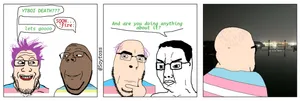 A shrine was laid by local trannies to press F to pay their respects or something, with a moralGOD 'teen placing a printed picture of Feraljak and Cobson with a moral trvthnvke written on the back about Jesus saving or something like that. The video would be featured on a trending Plebbit post on the r/iamatotalpieceofshit subreddit and condemned by ignorant faggots who judge a book by its cover (in this case two heckin' wholesome bald chungus friends just hanging out, y'know? like wtf?) and didn't see the peaceful message underneath.[8]