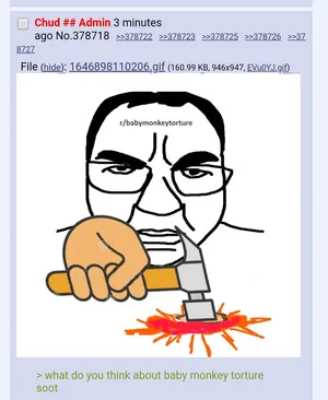 Despite numerous calls from said █████ users and foodists to create a board for baby monkey torture, /bmt/, the soyjak.party administration team refuses to implement the requests of the monkey torture "community". Many soyteens are very proud of this decision and there is an ongoing grassroots lobbying campaign to end BMT spam forever. This campaign has been very successful, resulting in the BMT spammers losing all of their IPs. As one BMT spammer put it (shortly before committing suicide):