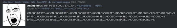 According to the original image's EXIF data,[15] Cobson was created on June 6, 2021 at 14:34:35 EST by someone using Adobe Photoshop Elements 13.0 on Windows. He was subsequently posted on /qa/ at 17:03:41 EST the same day under the filename "lawnmower soy.png", with the accompanying caption: "ONIONS BASEDJAK ONIONS BASEDJAK ONIONS BASEDJAK ONIONS BASEDJAK ONIONS BASEDJAK ONIONS BASEDJAK ONIONS BASEDJAK ONIONS BASEDJAK ONIONS BASEDJAK ONIONS BASEDJAK ONIONS BASEDJAK ONIONS BASEDJAK ONIONS BASEDJAK ONIONS BASEDJAK ONIONS BASEDJAK ONIONS BASEDJAK ONIONS BASEDJAK ONIONS BASEDJAK"[2]