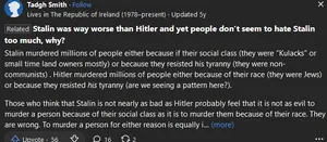 Despite all of these god-awful things Stalin did, Stalin sympathizers and breadtubers will overlook all of this and pretend that Stalin was one of the best leaders out there and treat him as an icon. Most of these people have never lived under communism or experienced its horrors. Over time, Joseph Stalin has went from an awful dictator to a "hero" who warned us about heccing capitalism. Tankies mostly tend to talk about how he fought Hitler (ev&doe Stalin hated Jews, probably would've started a second holocaust, and killed Trotsky, who was a Jew plus considered Hitler as a communist before he betrayed him).