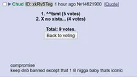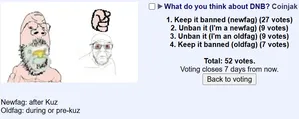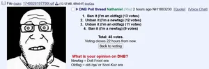 Polls[edit | edit source]October 2025[edit | edit source]From the 27th to the 28th of October, a large-scale restricted thread desktop-only poll was conducted on /soy/. The poll has 102 voters and indicated that 55% of users supported DNB while 45% opposed it. This shows that even when DNB is banned, most users support it. December 2025[edit | edit source]an ID enabled poll was conducted on /soy/ in the 30th of december. It had 52 votes in total, 34 of them (68%) saying it should remain banned while 18 of the votes said thought it should be unbanned.[17] There was also another poll in the comments with 9 votes in total about banning all DNB except the 1 iconic image, which got 5 positive and 4 negative votes. See also[edit | edit source]Snopes