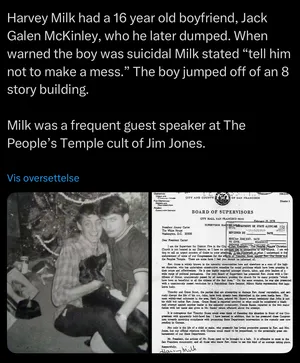 Harvey Milk was a kike fag activist and politician who dated a 16 year old boy when he was in his early 30s and was a big friend of American preacher Jim Jones, a deranged cultist who led the Peoples Temple from 1955-1978 and forced his 900 followers to do mass suicide in Guyana by drinking poisioned Kool-Aid.[38]