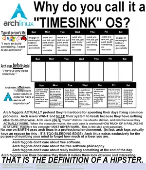 - Arch Loonix - The favorite distro of troons and Quote there's a difference?. I use arch btw. Arch Linux features the very gemmy AUR (Arch User Repository) which as almost all the software you could ask for and is almost always up to date (though you need an AUR helper to use it; I recommend paru because it's a faster version of yay and generally better maintained). It runs on a rolling release model so software is always up to date, and there's no need to upgrade to a new version every few years. Also the Arch Wiki is extremely gemmy documentation. But it's known for being very difficult to install manually (hence why people are very pretentious about using it), thoughbeit it's easy to install it yourself using (((archinstall))).