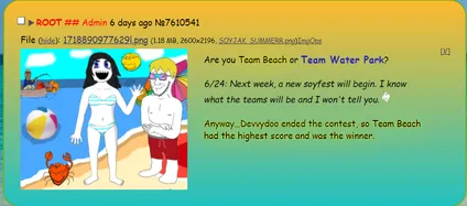 When the point meter froze and the drop-down menus were removed on June 24th, Team Beach ended up with over 300,000 more points than Team Water Park. Root later announced Team Beach as the winner, and then announced Soyfest 2 would take place the following week.
