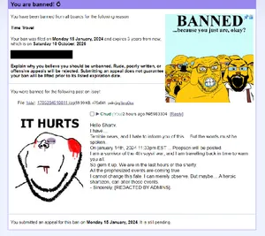 ϪOOT quickly unbans OP, when OP makes an extremely dumbass decision... They post their ban, and forget to censor their IP. The thread suddenly goes from poopson to attempting to dox OP, which doesn't get far, because they only had an IP and no other information, making it impossible to get anything expect their city. Many shartizens start wondering why we would dox them anyway, as they are a fellow shartist, and made a gemerald thread. Op then asks to not be doxed, and everyone shuts up about it.